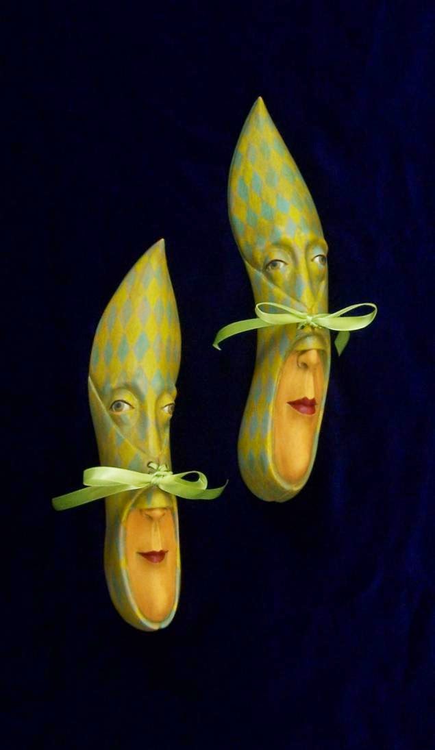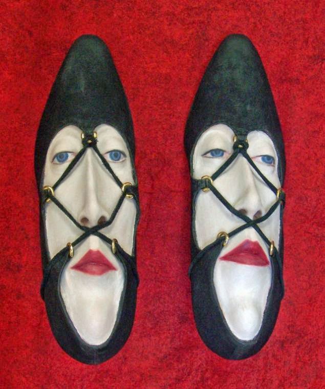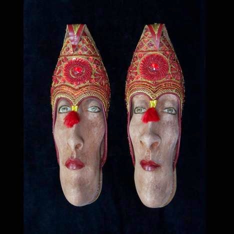 aquestes sabates com s'han transformat en les mans de Gwen Murphy. Són sabeaes reals, manipulades i il·lustrades, a cavall entre l'escultura, els ninots i la il·lustració.