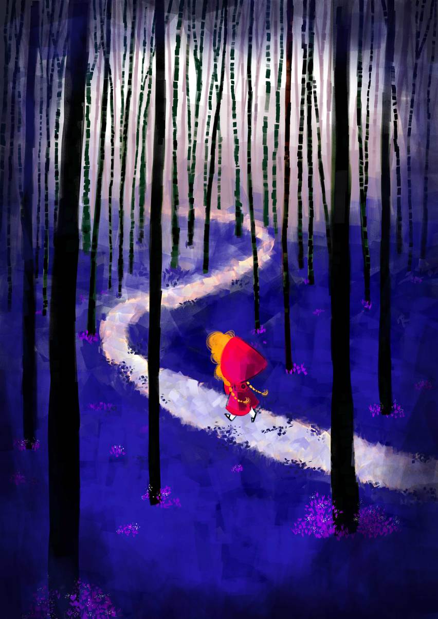 Passa el mateix amb les seues emocions, hi ha dies que sent por entre la boira que l'envolta i altres que va cantant alegrement mentre saluda als amics, dies que sembla cansada de portar una cistella tan plena de menjar i d'altres que ompli el bosc amb el seu cant que alleugera la càrrega. Una mateixa Caputxeta Vermella en un conte que sempre és el mateix i sempre canvia, com les versions il·lustrades dels artistes que hui hem seleccionat. questa vegada el llop deu estar descansant, doncs quasi com apareix.