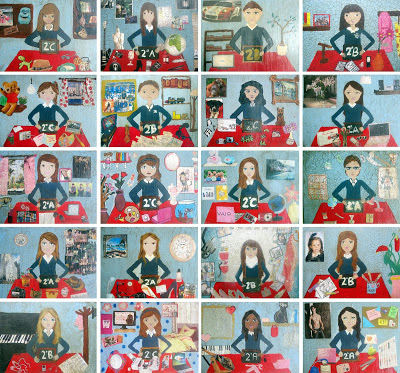 Se'n recordeu d'aquelles fotos que es fèiem de menudets a l'escola? Ficàvem cara d'interessants, assecats darrere d'una taula on solien haver-hi llibres i un globus del món. Doncs d'aquelles fotos ha sorgit tota una proposta il·lustrativa per a l'aula. La idea sorgeix d'una il·lustració de Gustavo Aimar, El pupitre rojo. A partir d'aquesta imatge els alumnes de Segon d'Educació Secundària del col·legi Compañía de Maria de Jerez, varen fer els seus propis autoretrats...