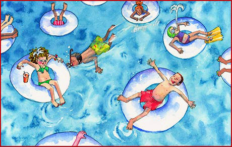 XoF! A la piscina... un bon bany refrescant és el que necessitem per a mitigar la forta calor que està fent estos dies. Xiquets, joves, grans, avis, animals... tots a banyar-se. Tots a la'igua! Què atraient és la piscina a l'estiu. Esperem que ho paseu tan divertit dins de l'aigua o a la seua vorera com en aquestes il·lustracions.