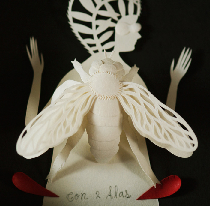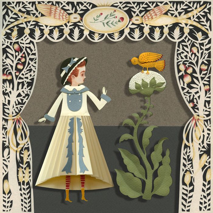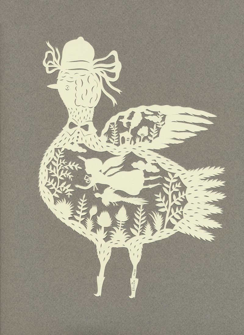 Il·lustracions amb paper retallat, que canvia segons el fons que li fiquem... és difícil i molt bonic. Per als xinesos és tot un art, però a l'occident tenim també molt bons il·lustradors que utilitzen aquesta tècnica, com Elsa Mora.